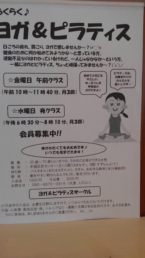 初めての方にもやさしい、ゆったりとした呼吸法のヨガと、お腹まわりのかんたんな筋トレ~ピラティスのサークルです。